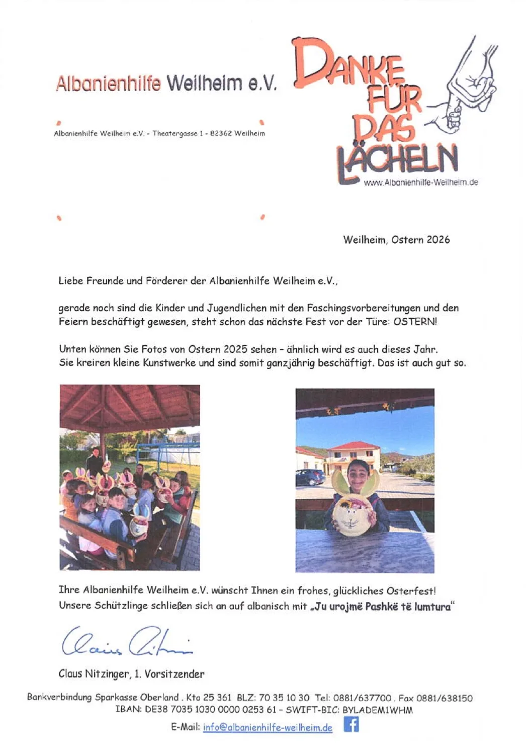 Die Albanienhilfe Weilheim e.V. wünscht Ihnen ein wunderschönes Osterfest und weiterhin alles gute für den weiteren Verlauf des Jahres!