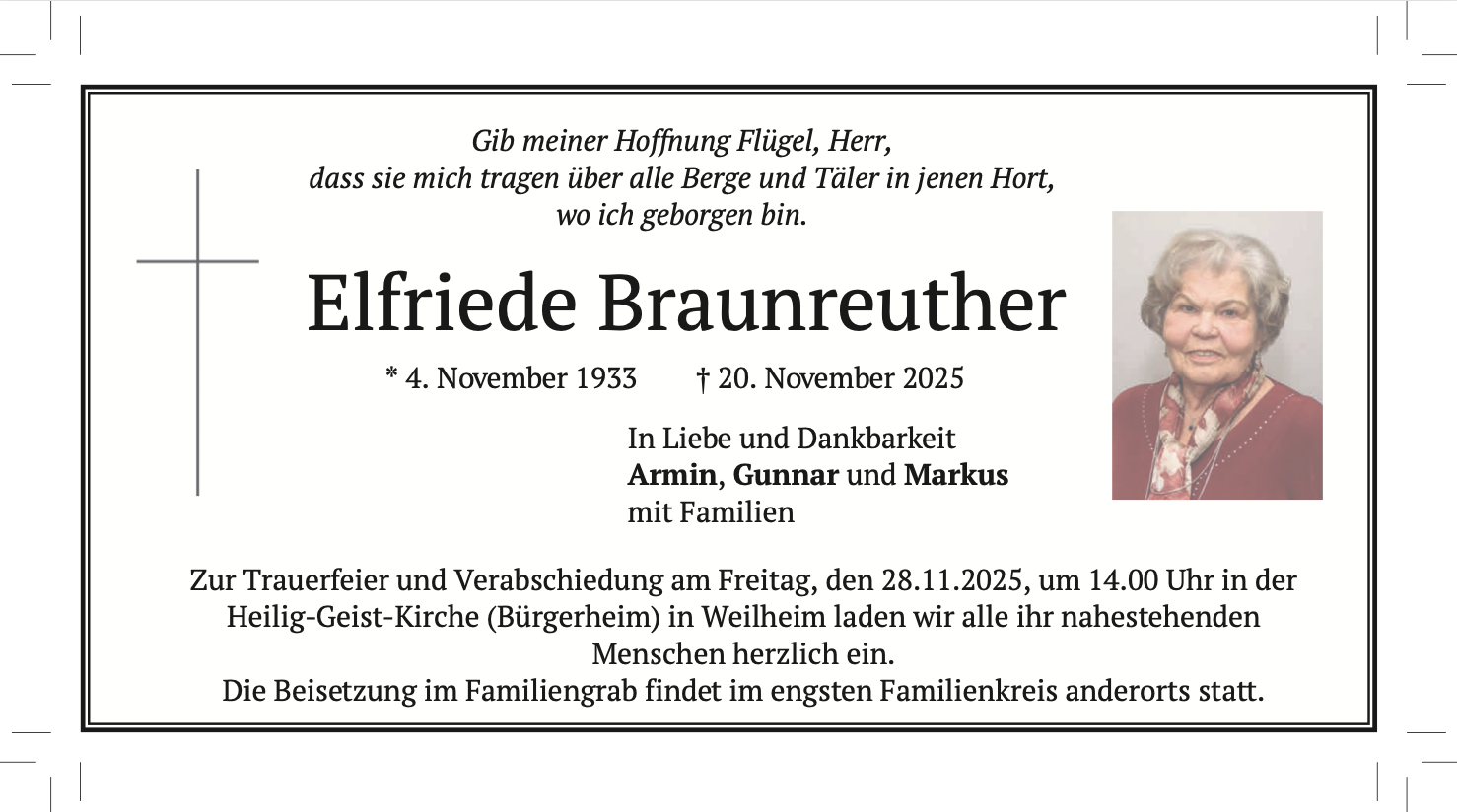 In wunderbarer Erinnerung und einem herzlichen "Vergelt´s Gott Frau Braunreuther" wünschen wir ihr eine gute Reise zu einem besonderen Ort. "Pfüat Gott!"